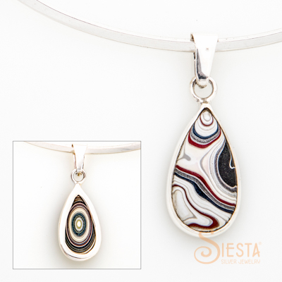 Every piece of Fordite, also known as Detroit Agate, is a unique object of beauty. Like agate Fordite is cut and polished to reveal the swirling patterns of colors inside. Unlike agate, Fordite comes not from the ground but from the retired paint shops of the automotive industry. In the old style of painting cars there was a great deal of overspray. This paint built up layer by layer and was baked at high temps between coats. As the story goes, paint shop workers would sometimes knock chunks of the paint buildup loose and take them home as souvenirs. The colorful buildup was beautiful in its raw form and turned out to be breathtaking once cut and polished, perfect for use in jewelry. No one knows how much Fordite was saved. Modern processes are no longer creating this amazing byproduct. All we know for sure is it looks great in our Siesta earrings, pendants, bracelets, cuff links and rings!